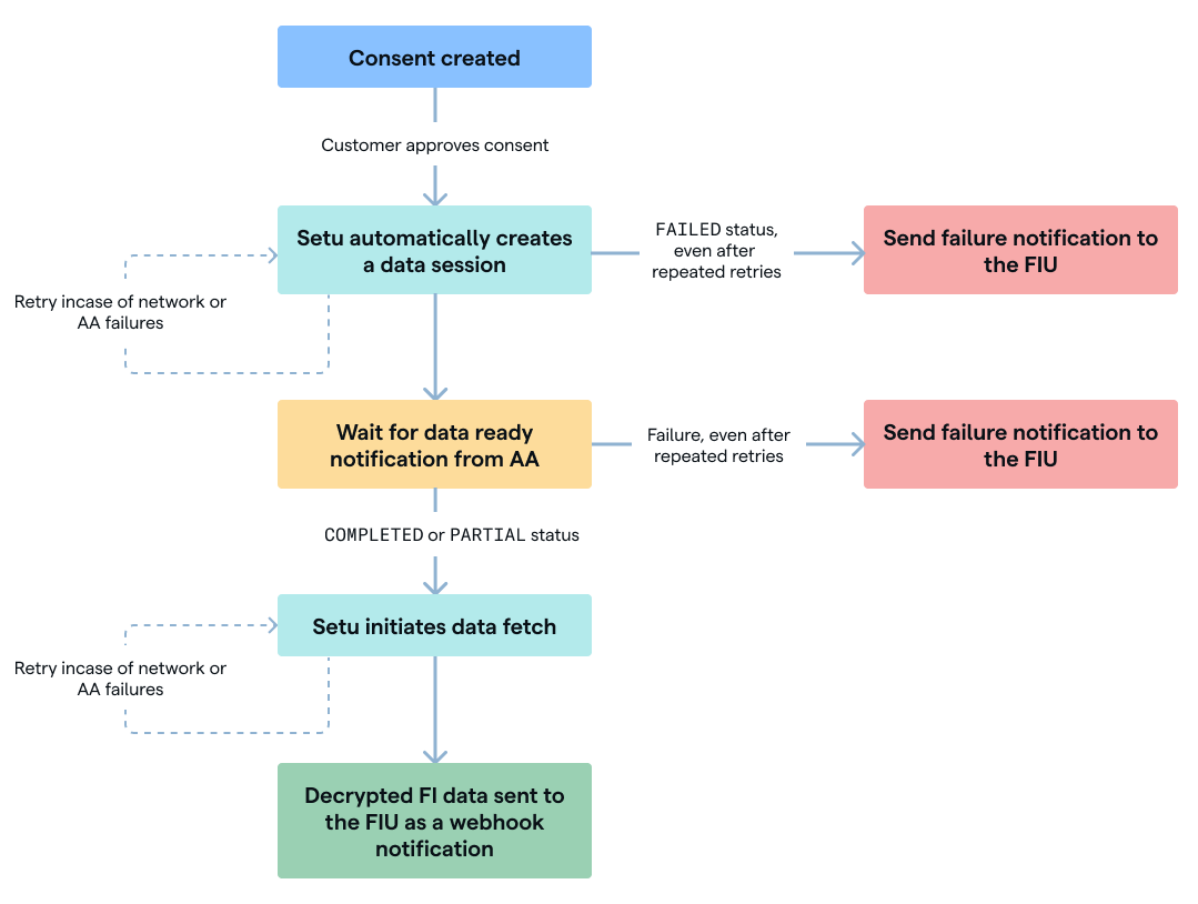 As seen above, once a consent is approved, FIUs need to create a data session, listen to notifications and then fetch FI data.