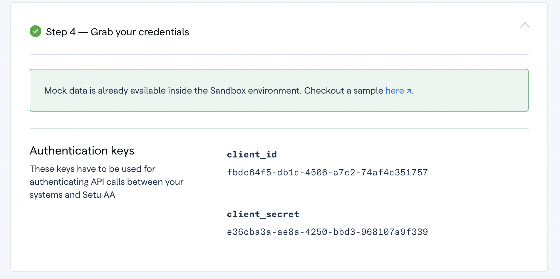 Once all the above steps are complete, you can grab your sandbox credentials, client_id and client_secret. You're now ready to integrate FIU APIs and make API calls using Postman on sandbox.