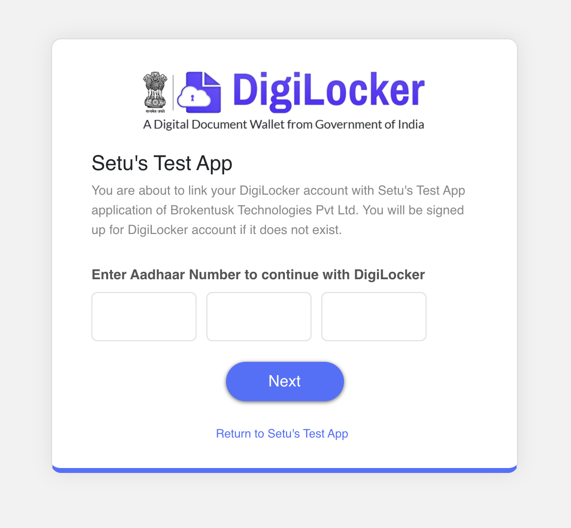 A DigiLocker account is not mandatory for a user to start this flow. If the user does not have a DigiLocker account, DigiLocker will automatically create an account during the consent journey. User has to sign up by providing their Aadhaar number and authenticate with the OTP sent to Aadhaar registered mobile number.